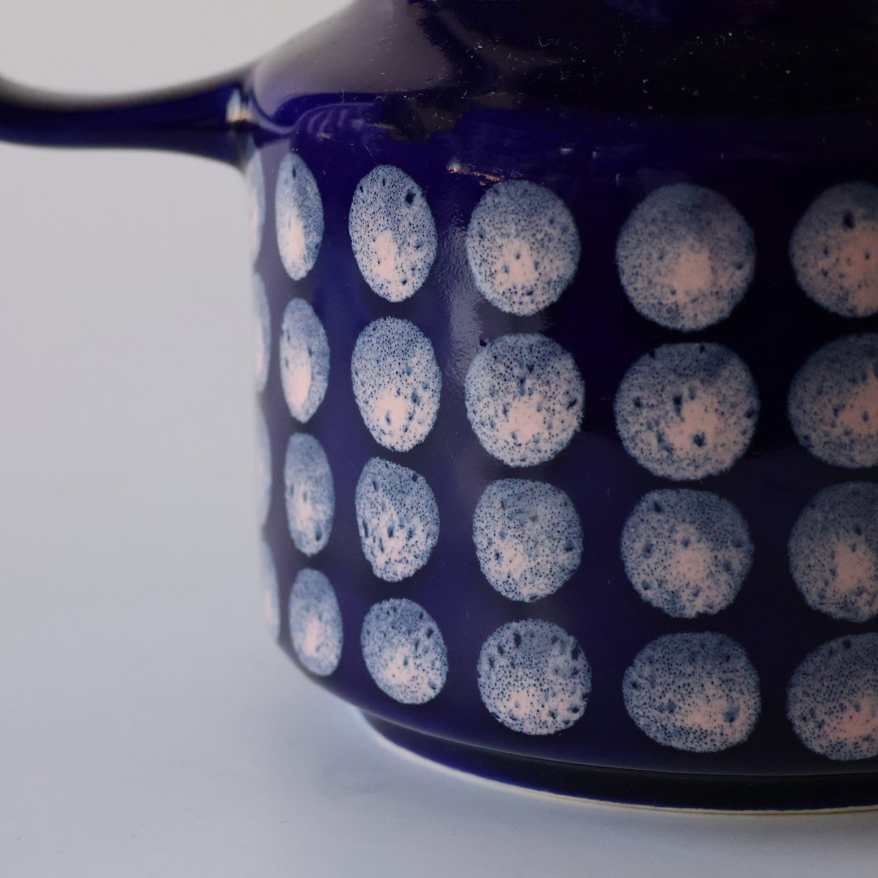 サファイヤブルーという色味なんですが、実物見ると、艶やかで、なんとも言えない吸い込まれそうな色合いがたまらん。対照的なピンクのドットとのバランスが絶妙なのです。ピンクドットも一つ一つちがっていて、なんとも素敵なアートのようで、そのまま飾りたくなる。