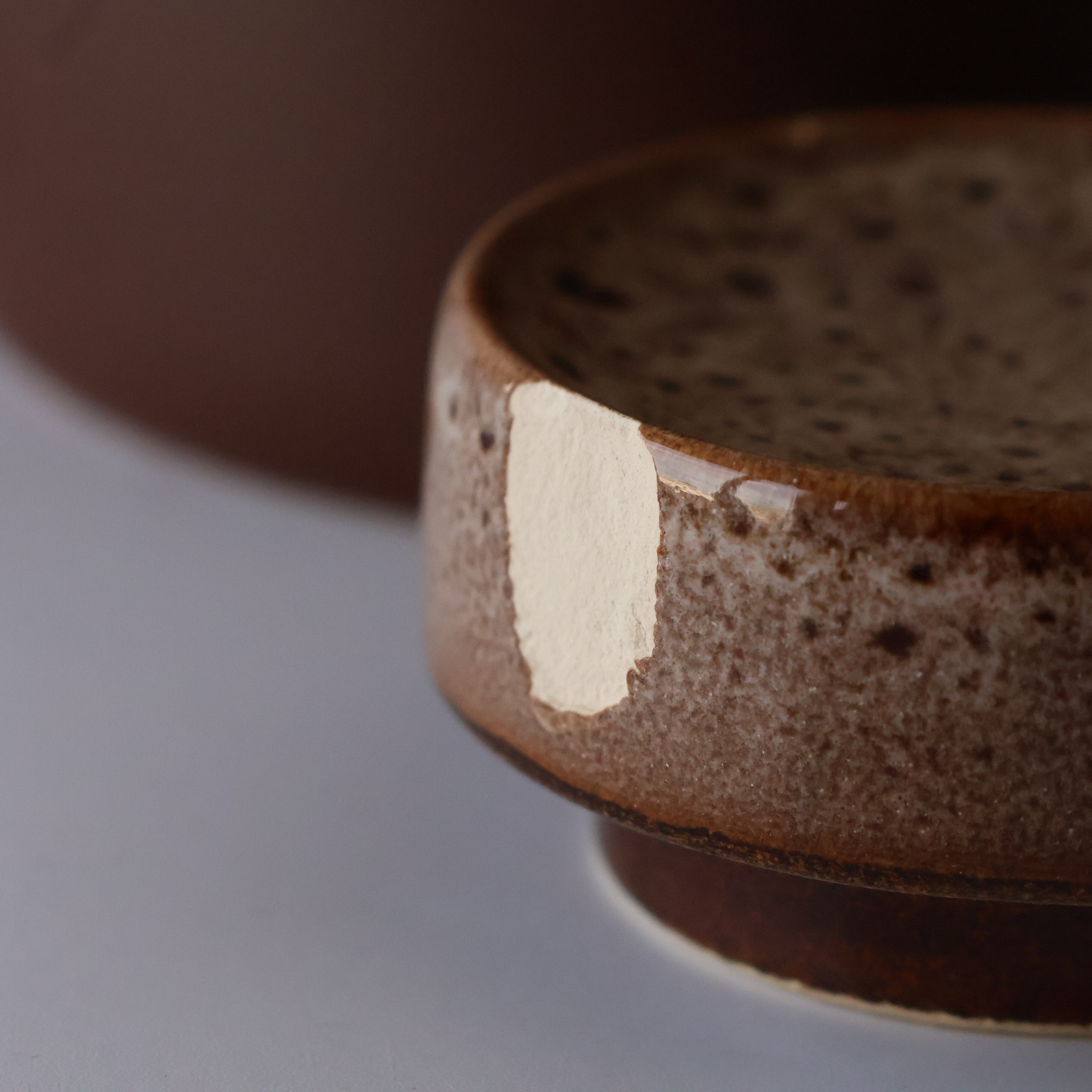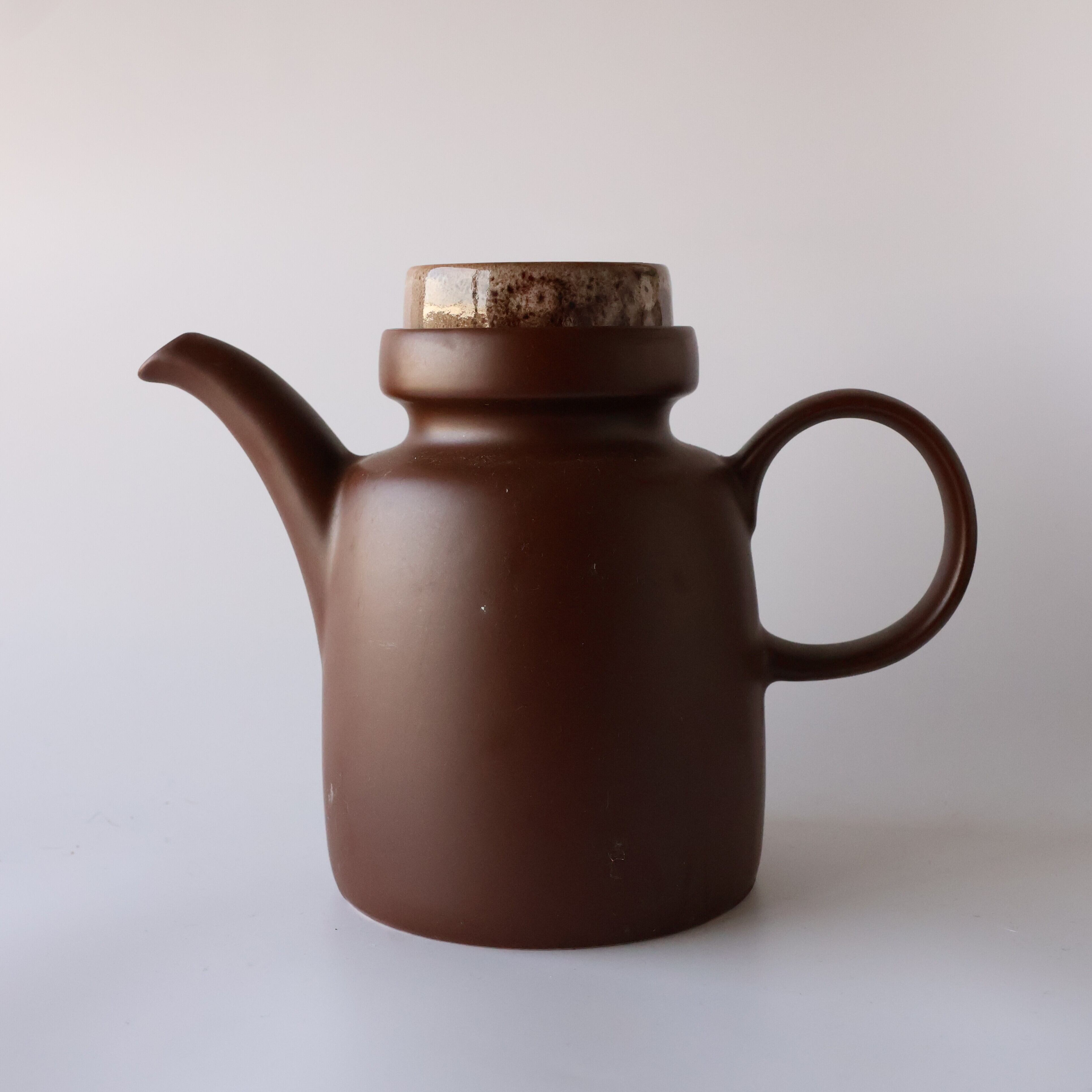 ポットのボディはマットなブラウンで、蓋は味のある釉薬。このデコレーションは Rohdentalで、どこか溶岩を思わせるような、ドイツの花瓶で有名なファットラバのような、独特の風合いを持っています。