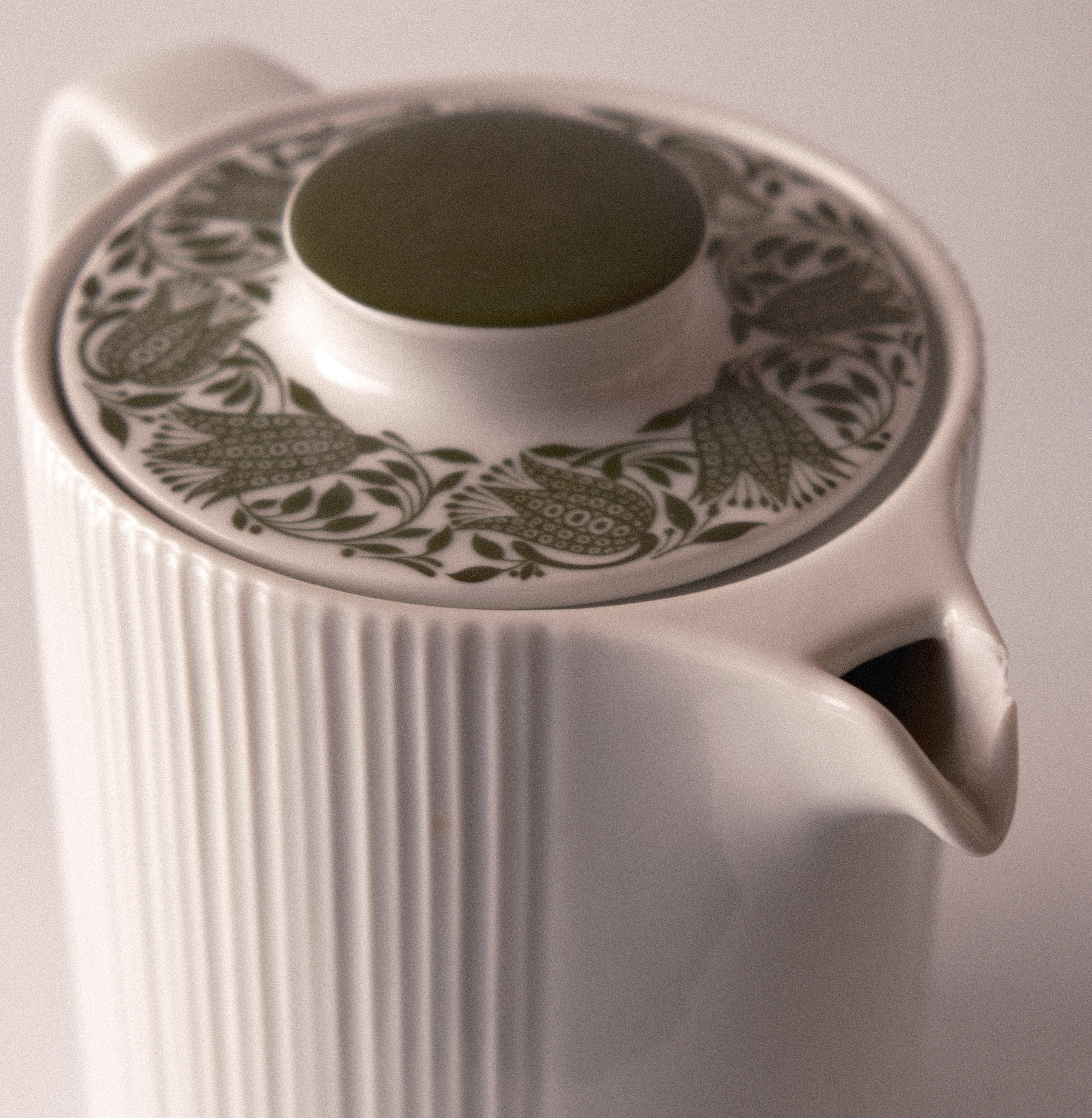 ポットの側面は波打ち、蓋は緑の草花が咲きほこり、自然豊かな北欧がたっぷり表現されています。