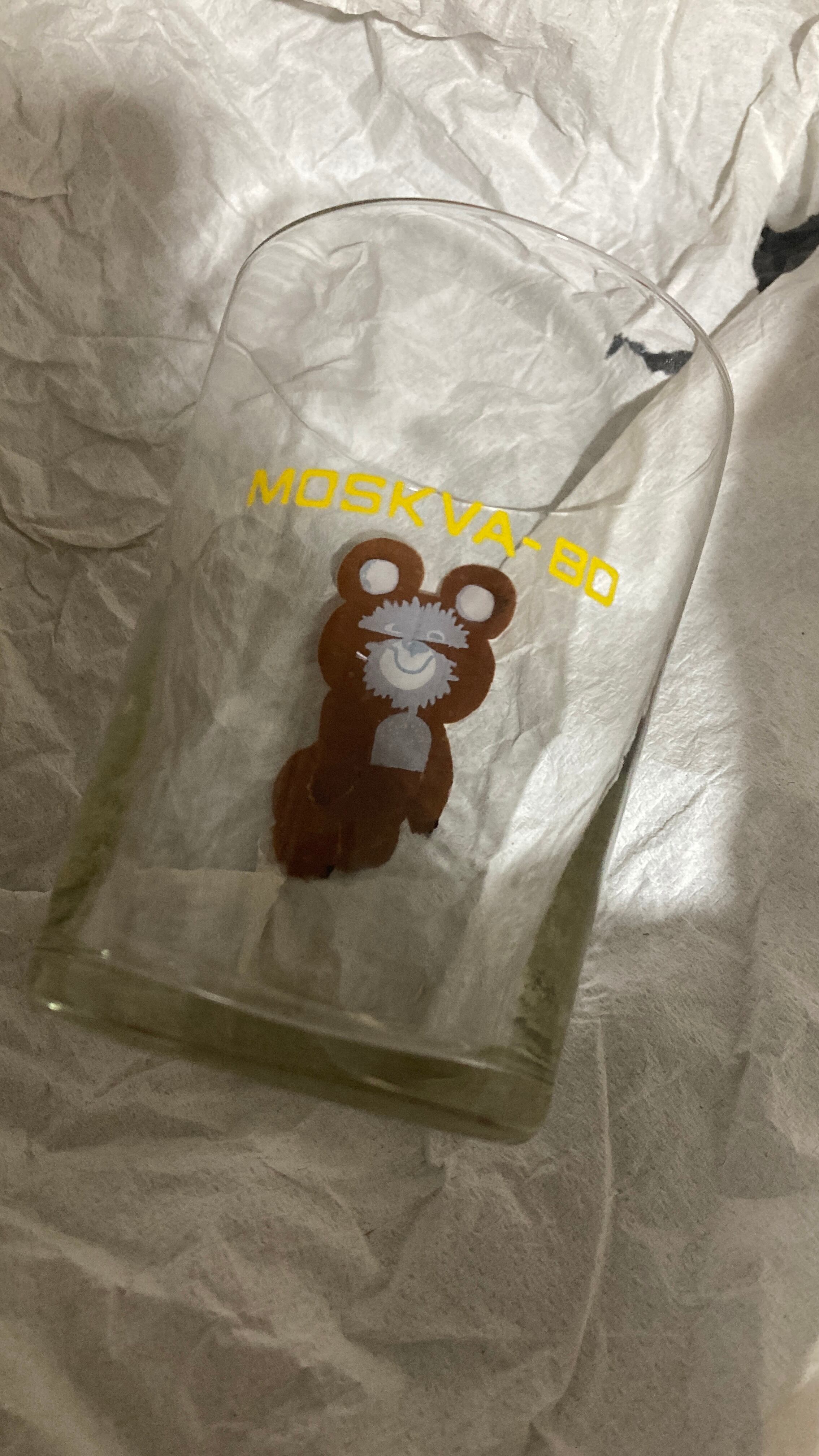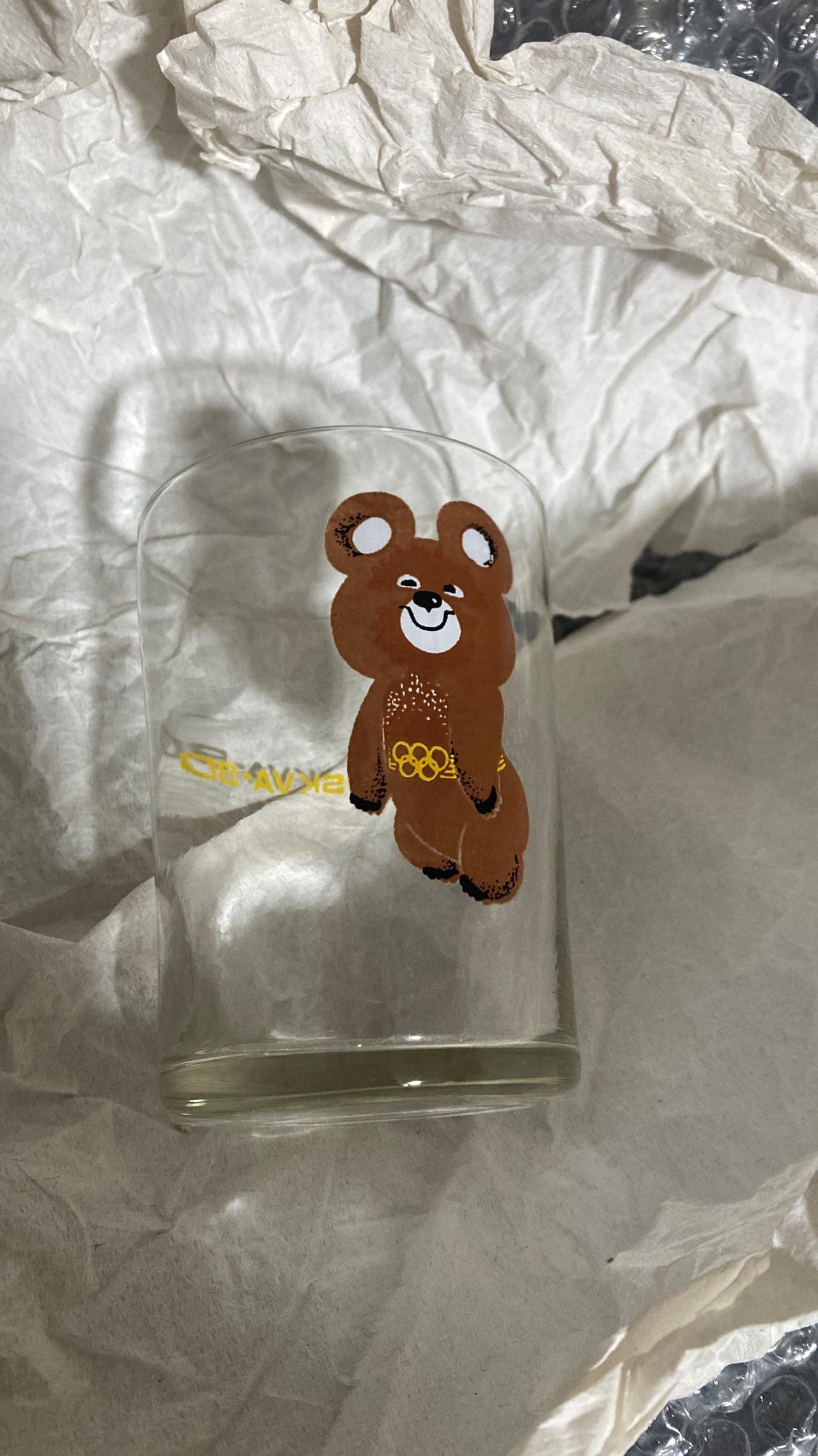 1980年に開催されたモスクワオリンピックの公式マスコットキャラクター、こぐまのミーシャが描かれたヴィンテージグラス。