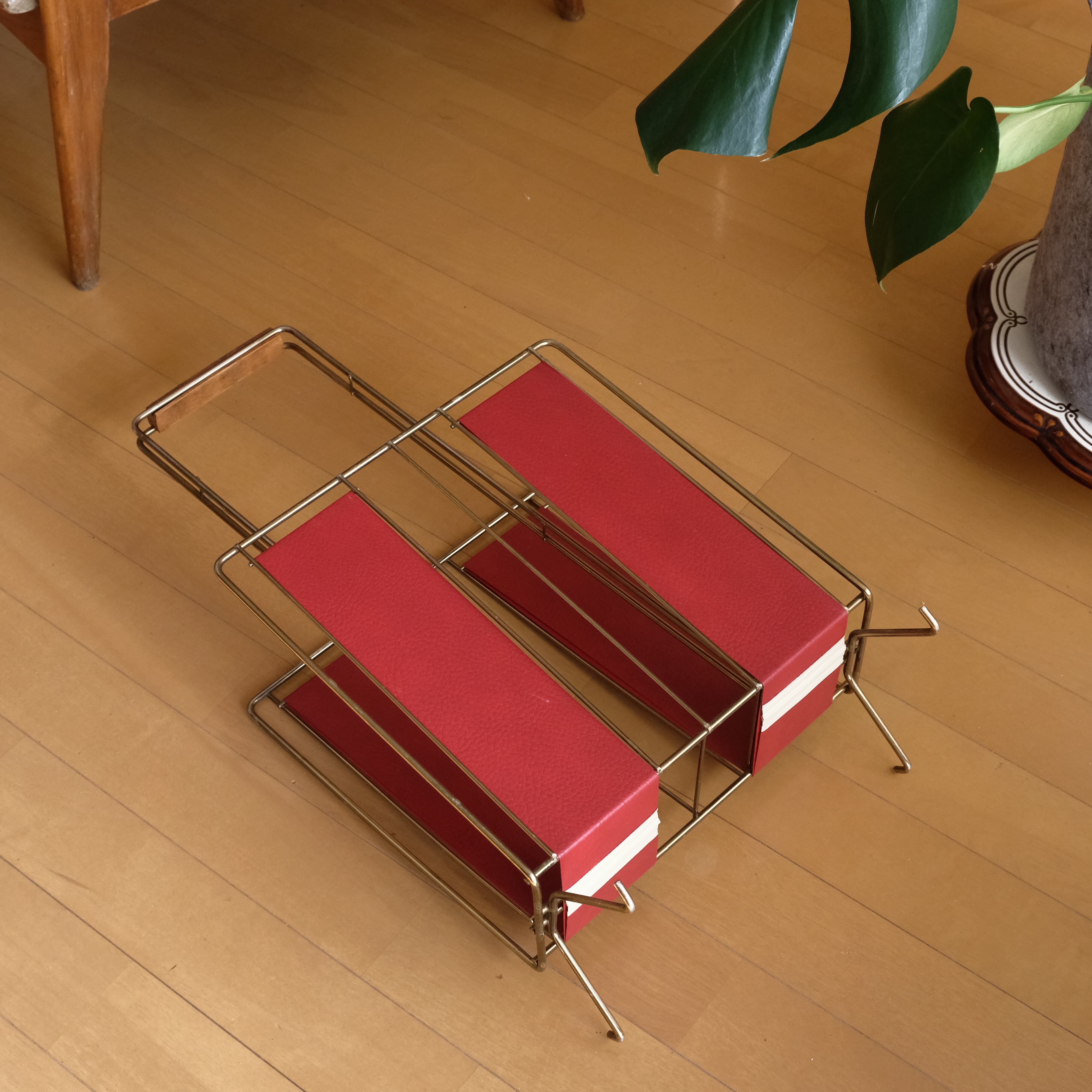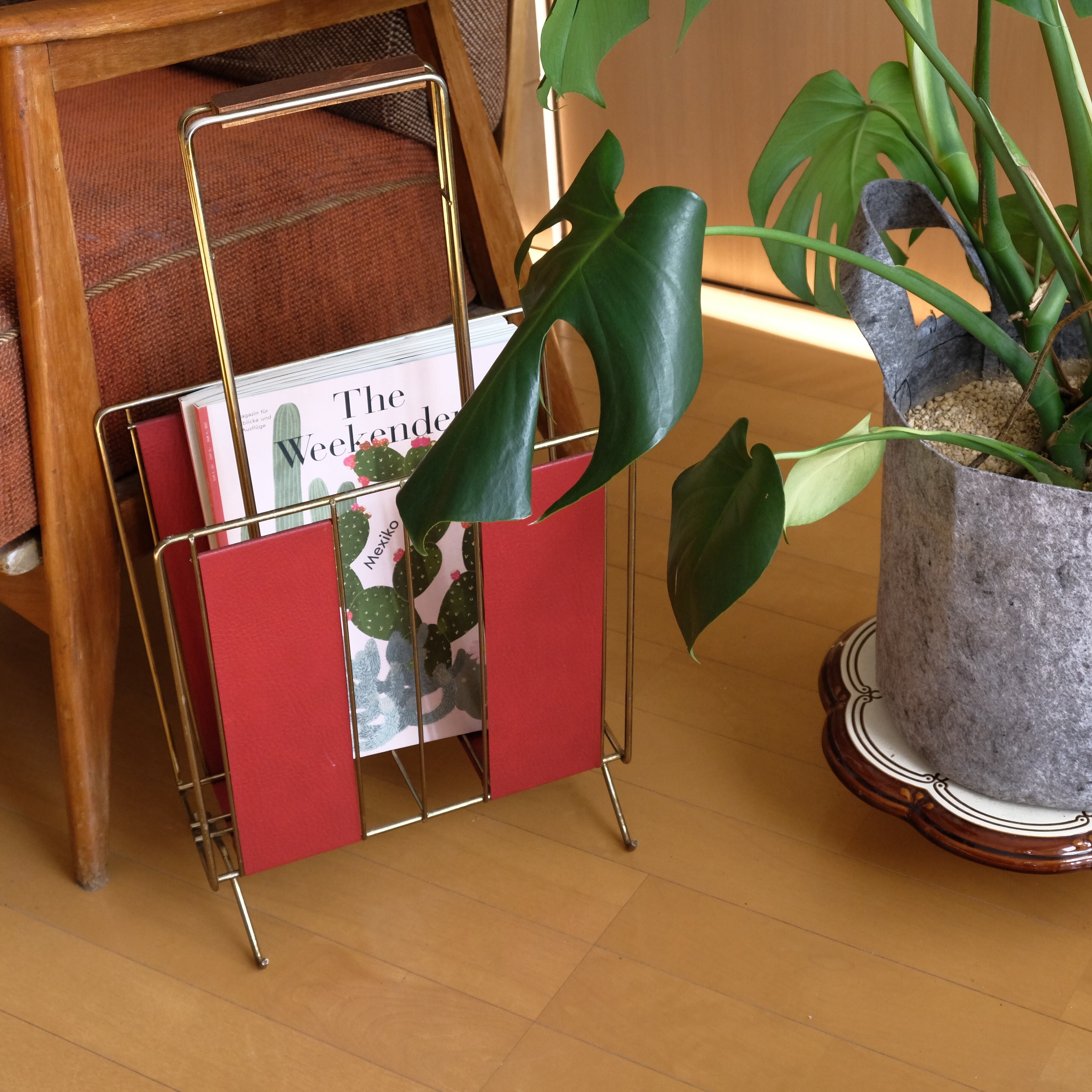 ワイヤーマガジンラックって、単一素材でシンプルミニマルなものが多く、これもかっこいいですが、このウッドの持ち手に、ゴールドの金属、赤い帯がレトロ感抜群で存在感があって格好良いと思うのです。(赤い部分は、革に見える加工がされていますが、おそらくプラ系だと思います。こういった素材は東ドイツ時代によく使用されていました。)取っ手がついてるので、持ち運びがしやすいのもポイント。ソファで読んだ読みかけの本を入れておいて、寝るときにはベッドのそばに。手が空いた時に読みたい本や雑誌を入れておくのはもちろんですが、インテリアの一部として、置いているだけでも絵になるんです。