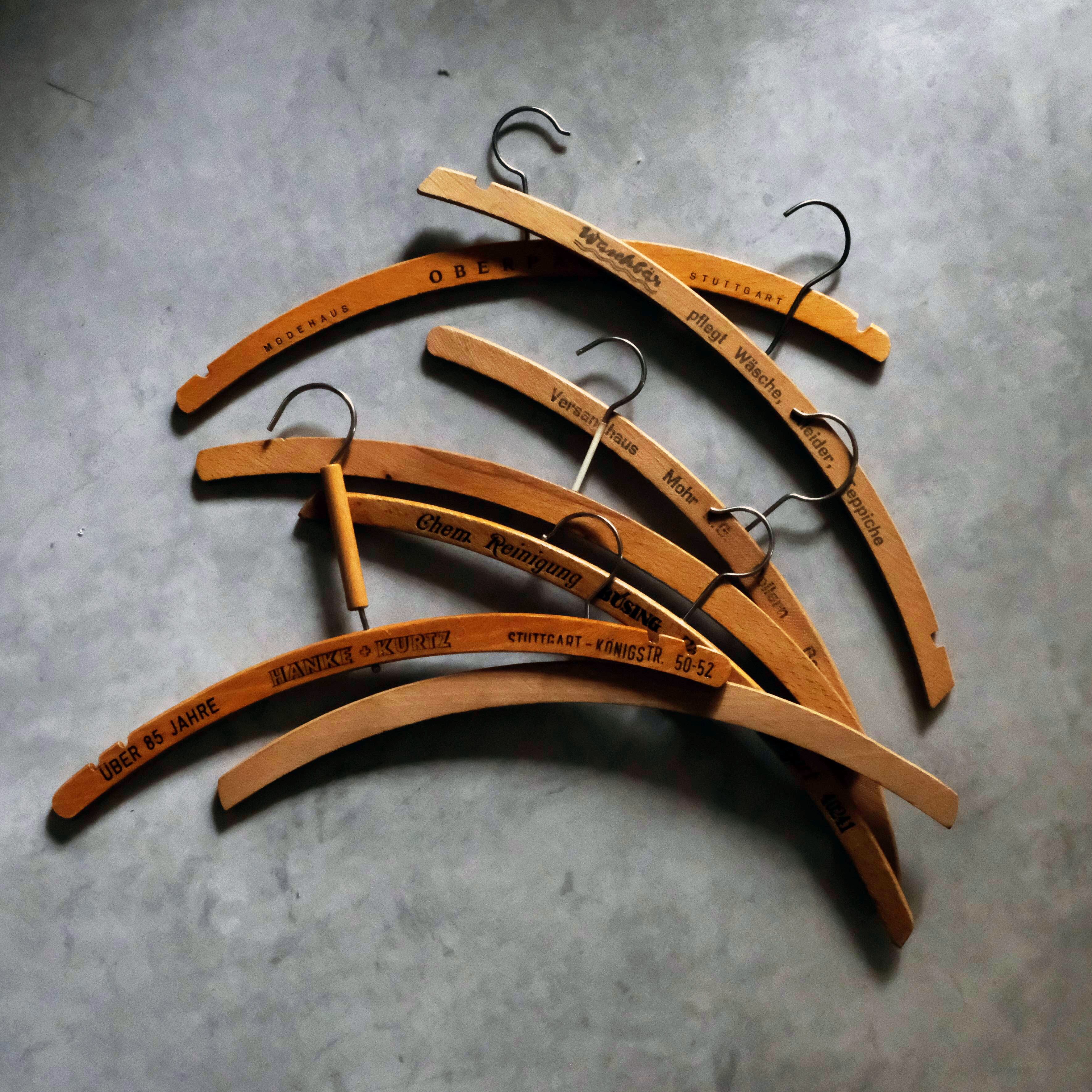 私、木製ハンガーすごく好きです。ドイツ語が書いてあるものは、ここで使われてたんだー、と想いを馳せれるし、無骨ながらも木の温かみが感じられて、全部全部愛おしい。今は、クリーニング屋さんから帰ってくる服には、プラスチックだったり、針金のハンガーだったりがついてきますが、時間が経つと割れたりゆがんだりしてしまうもの。"木"だからこそ時を刻んでもこうして人の手に渡るんだな。