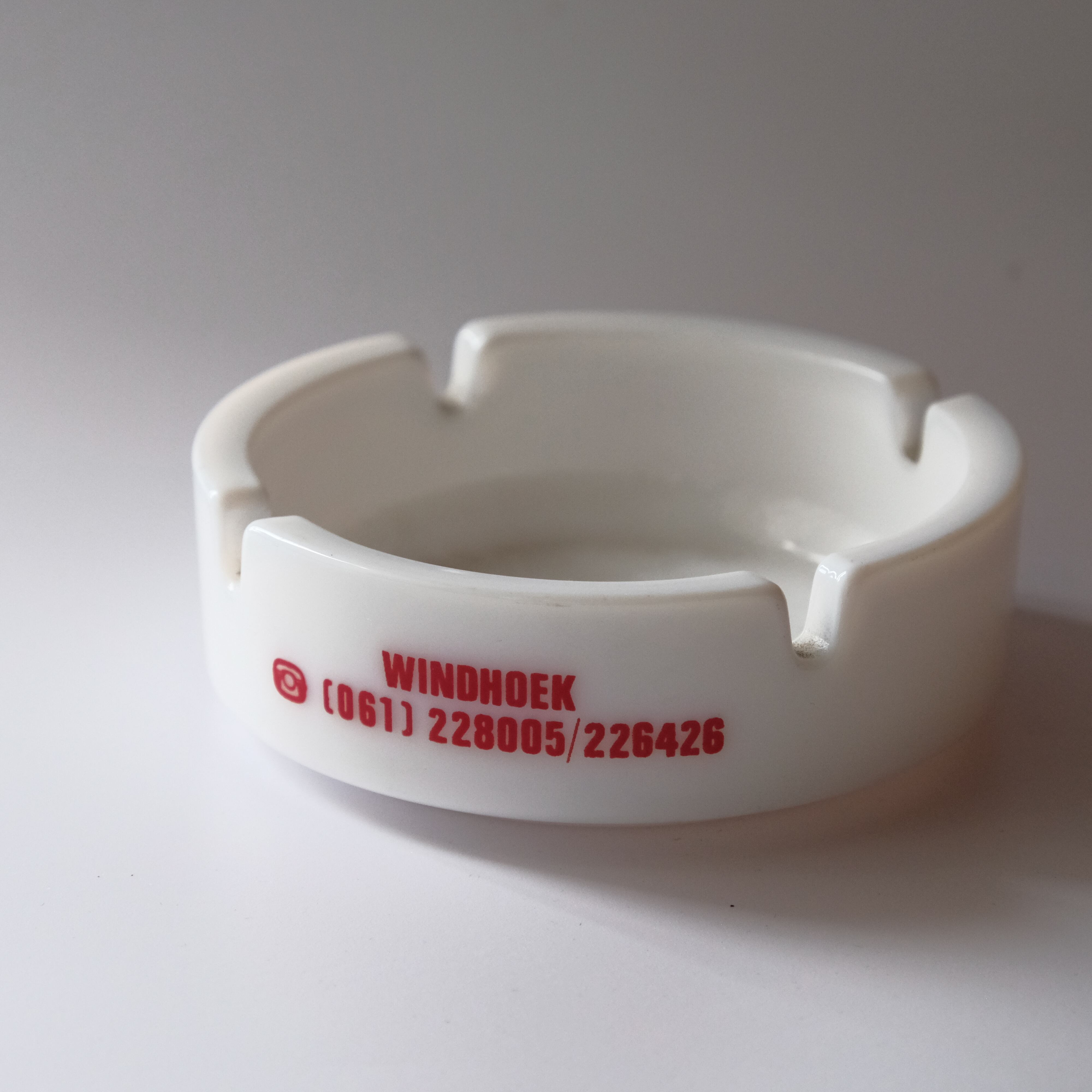 ナミビアのセカンドハンドショップで見つけたアイテム。1980年に設立された会社のものなので、あまり古くはないですが、ミルクガラスの白に赤い文字がレトロで可愛いなと。電話番号が書かれていて、おそらくノベルティ的なものだったのかなと思います。
