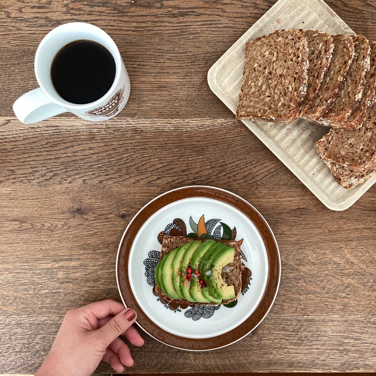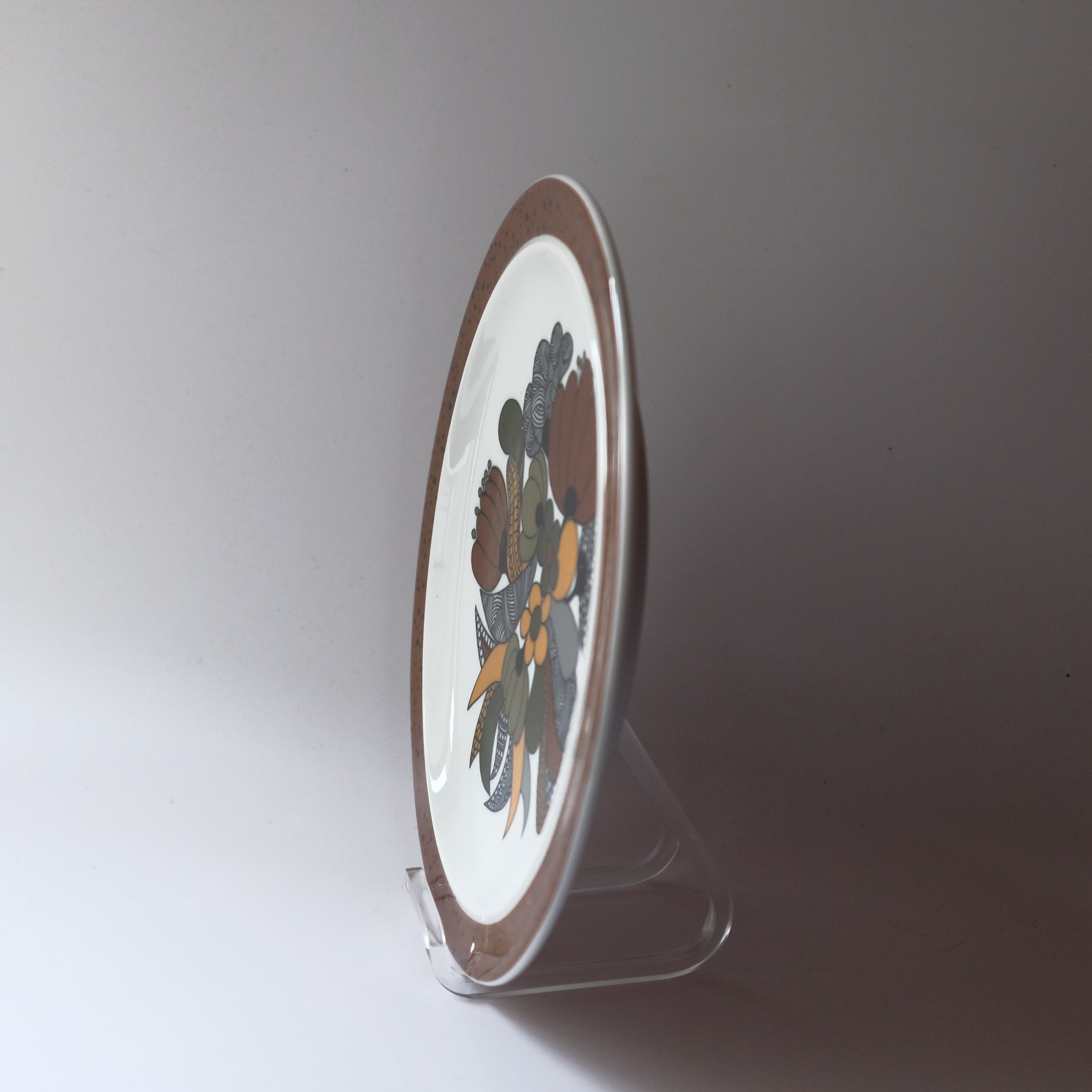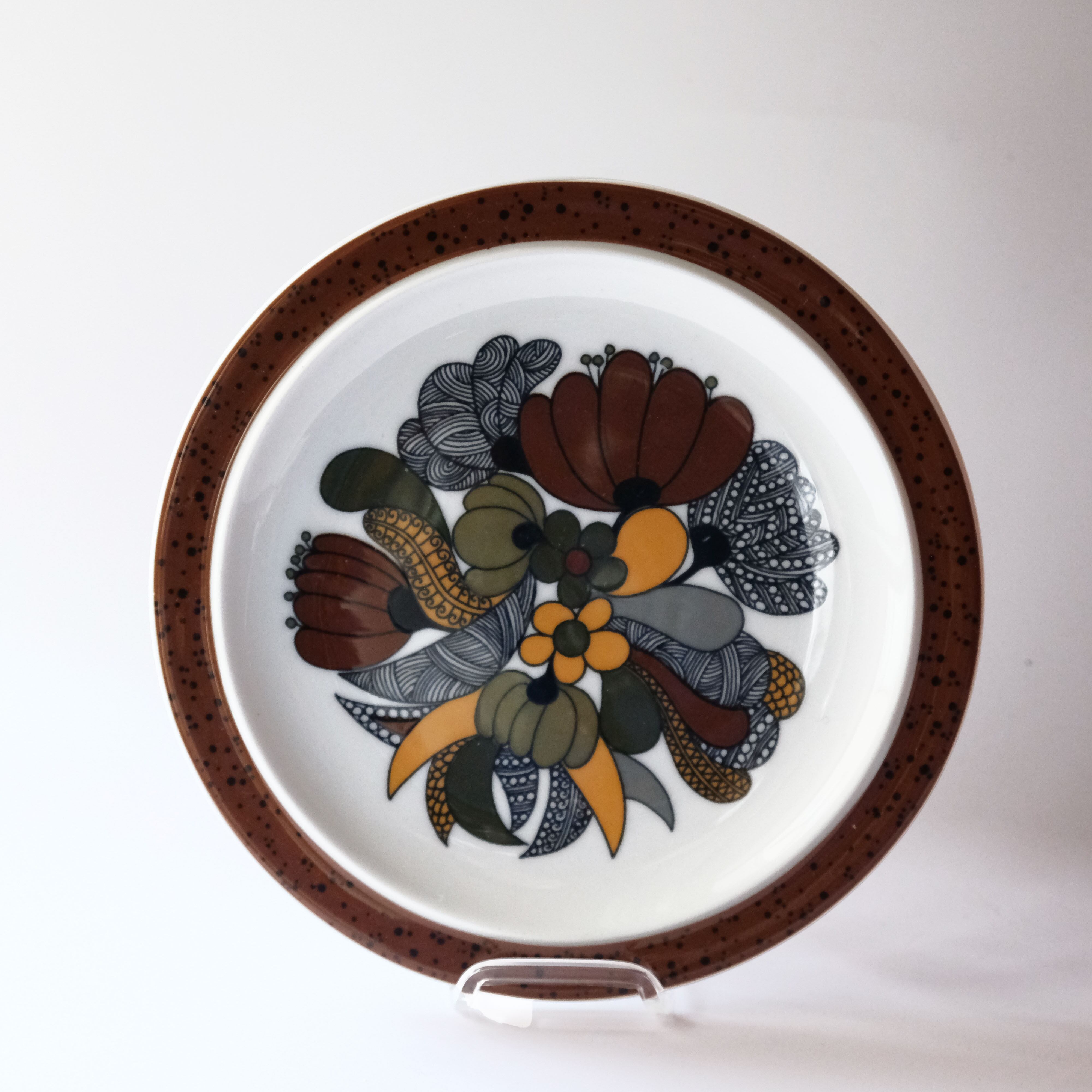 1970年代に製造された„Kiruna“シリーズは、ころんと丸みのあるフォルムに大胆なボタニカルデザインが特徴で、一面に描かれたブラウンの植物が可愛いです。