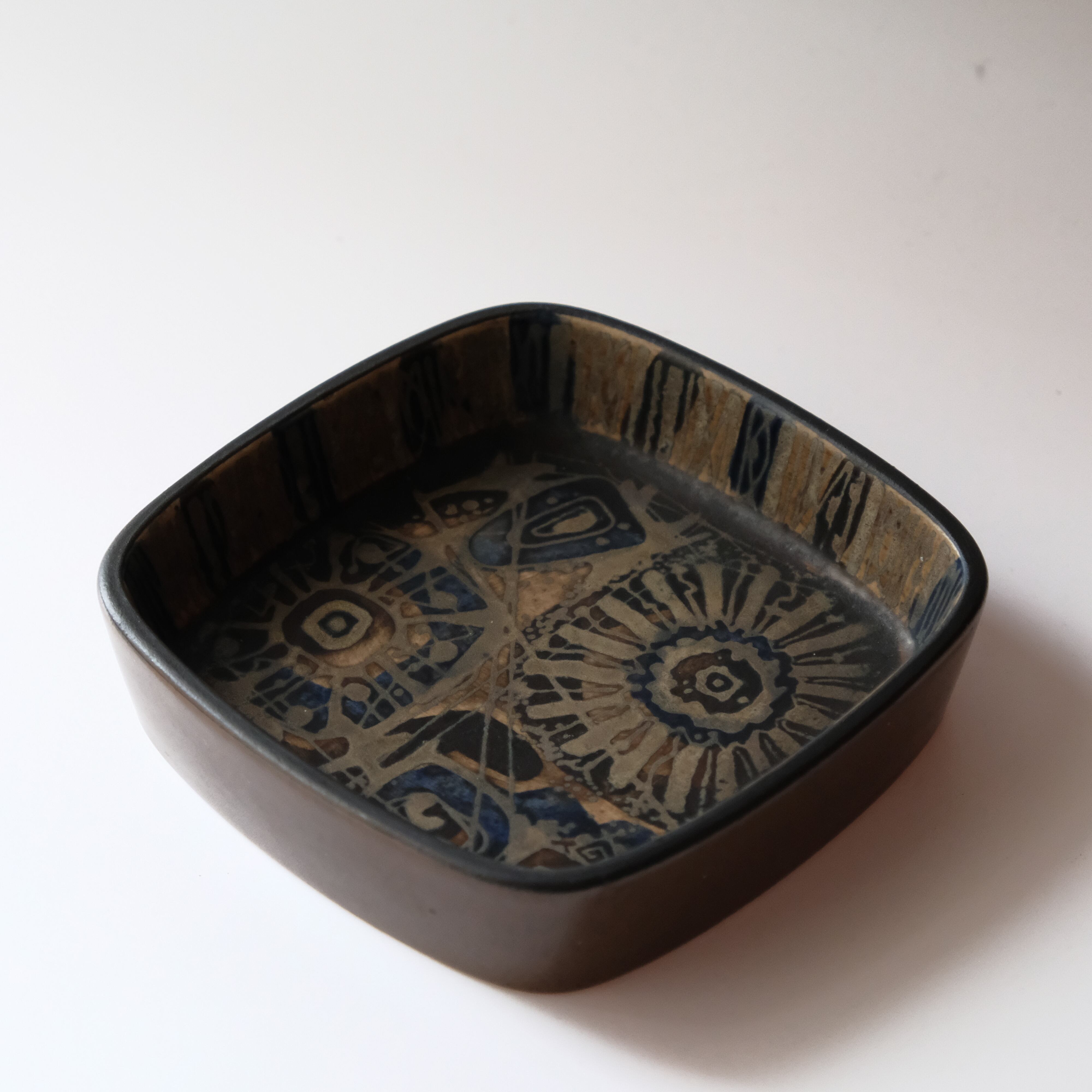 外側はつるっと、内側は版画のように重ねて立体的に描かれ、凹凸のある質感です。全体がおちついたブラウンなので、ヴィンテージ家具とも良く合いそう。スクエアプレートは3サイズあり、こちらは一番小さい11cm。両手に収まるサイズです。