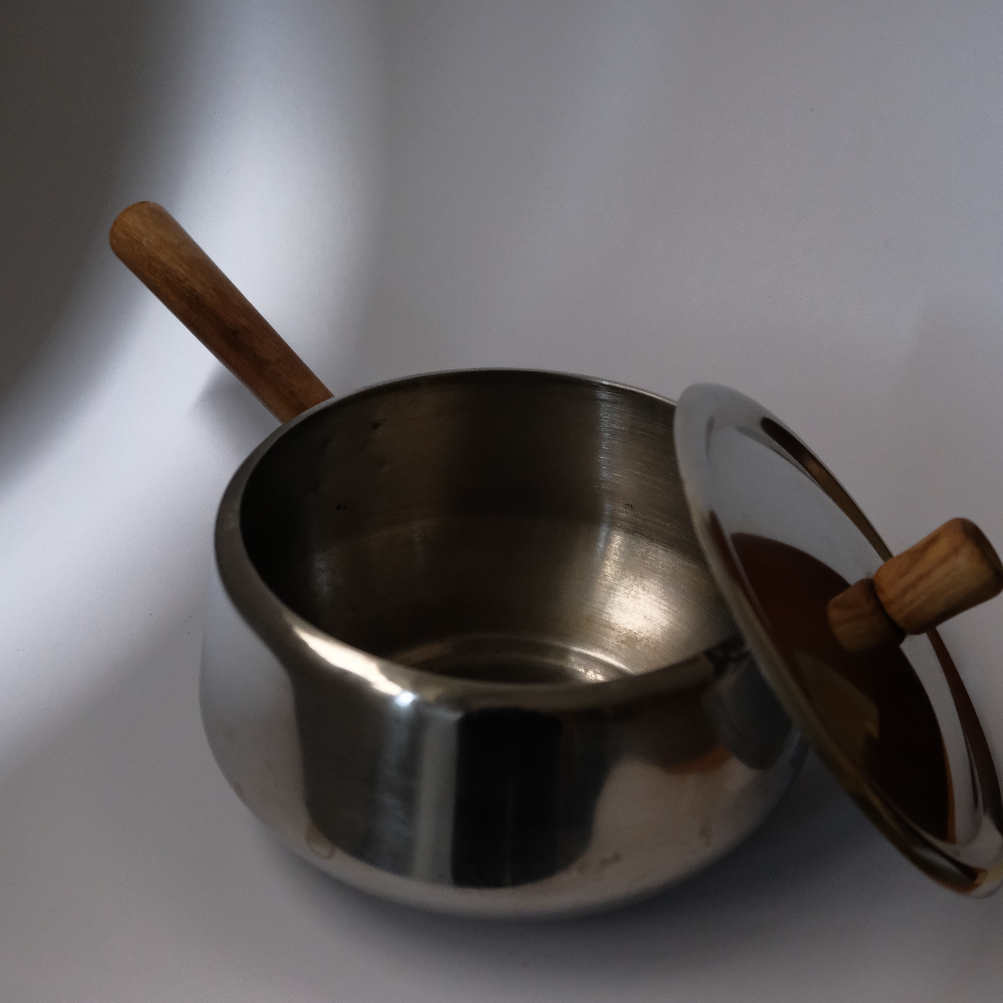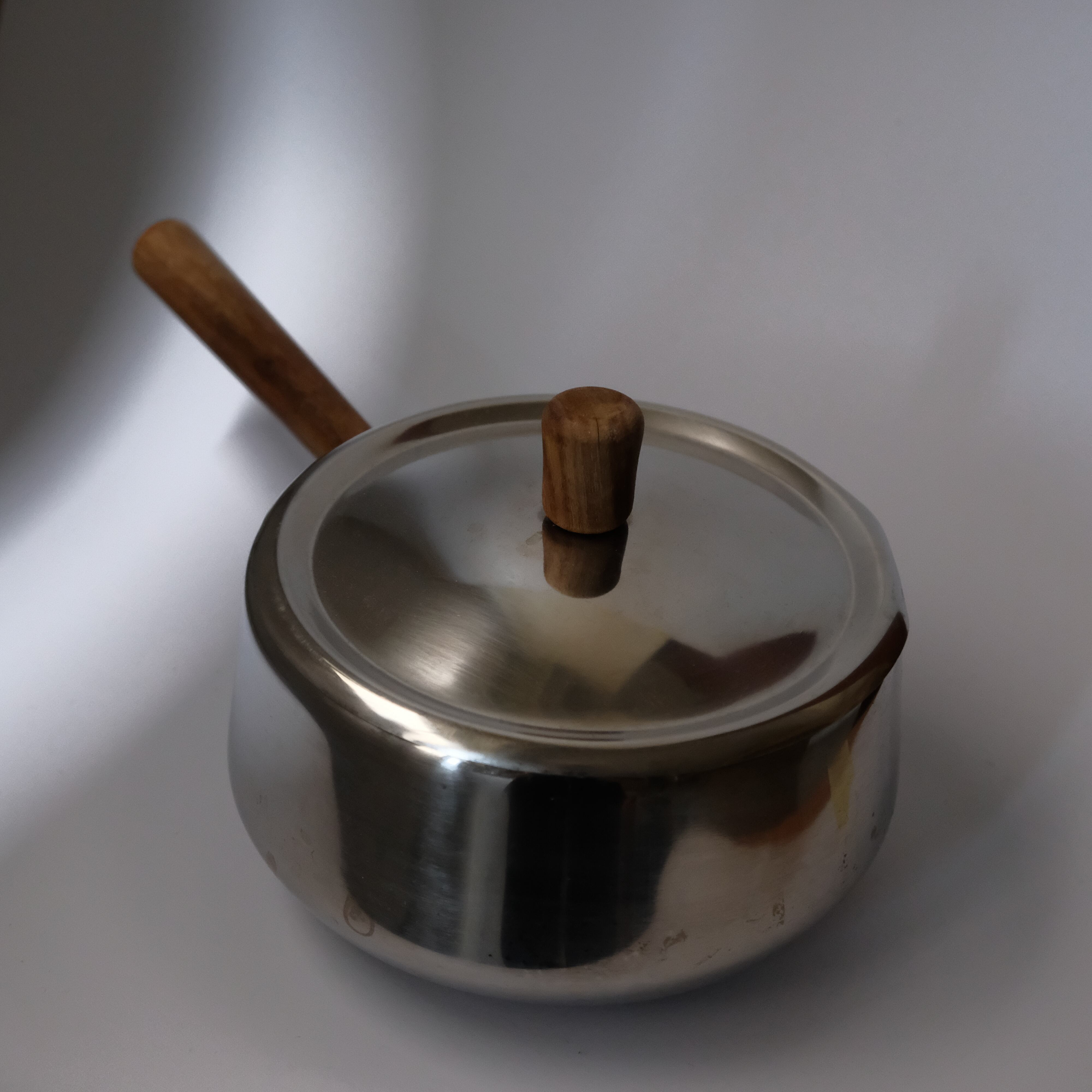 オランダで見つけた、ヴィンテージの蓋つきステンレス鍋。木製の持ち手がついています。