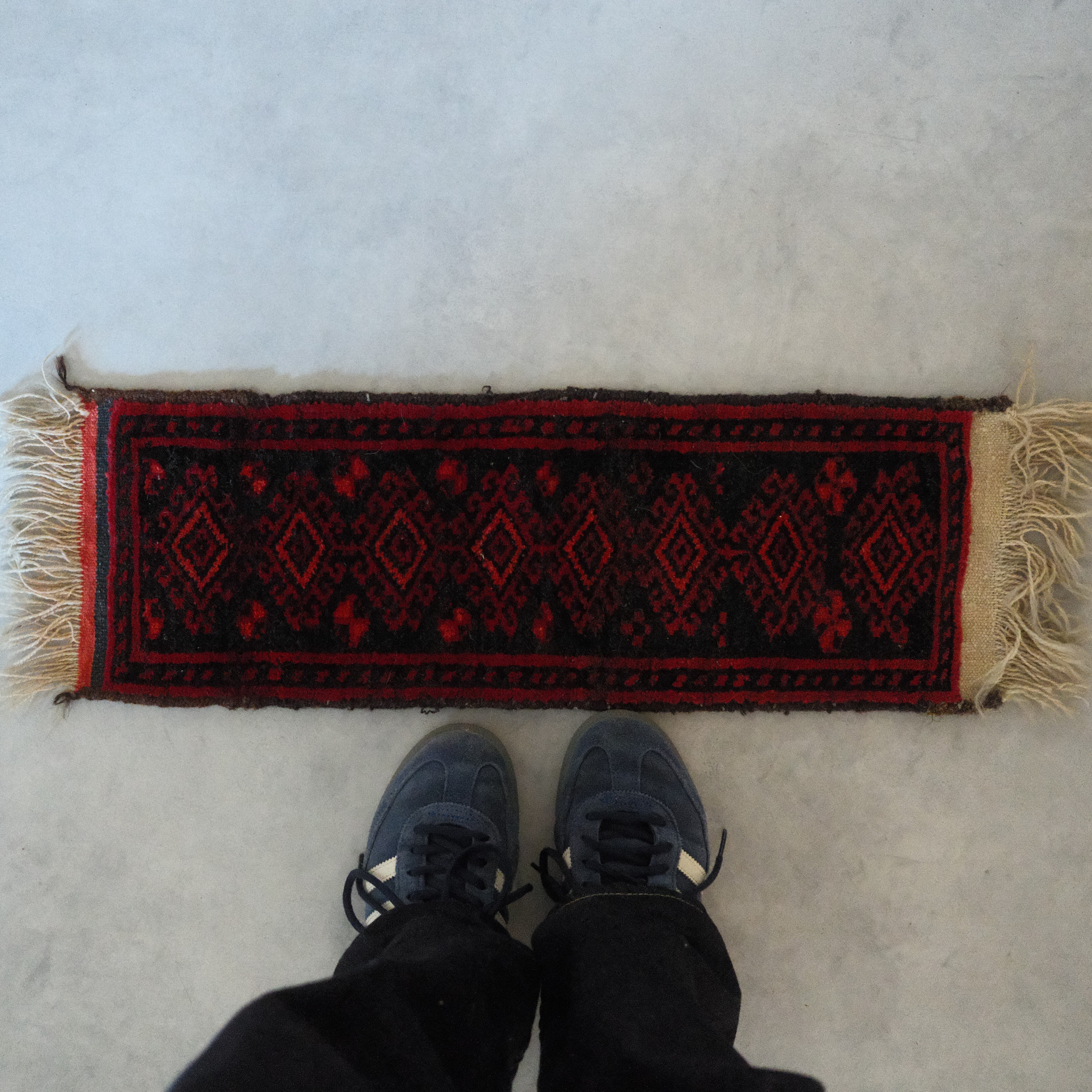 赤と黒で構成された、毛足の短いさらっとした肌触りのラグです。小さめのラグなので、花瓶敷にぴったりです。表裏同じ柄です。