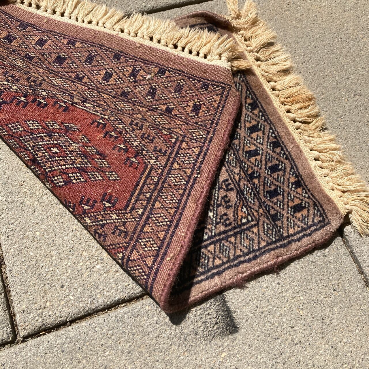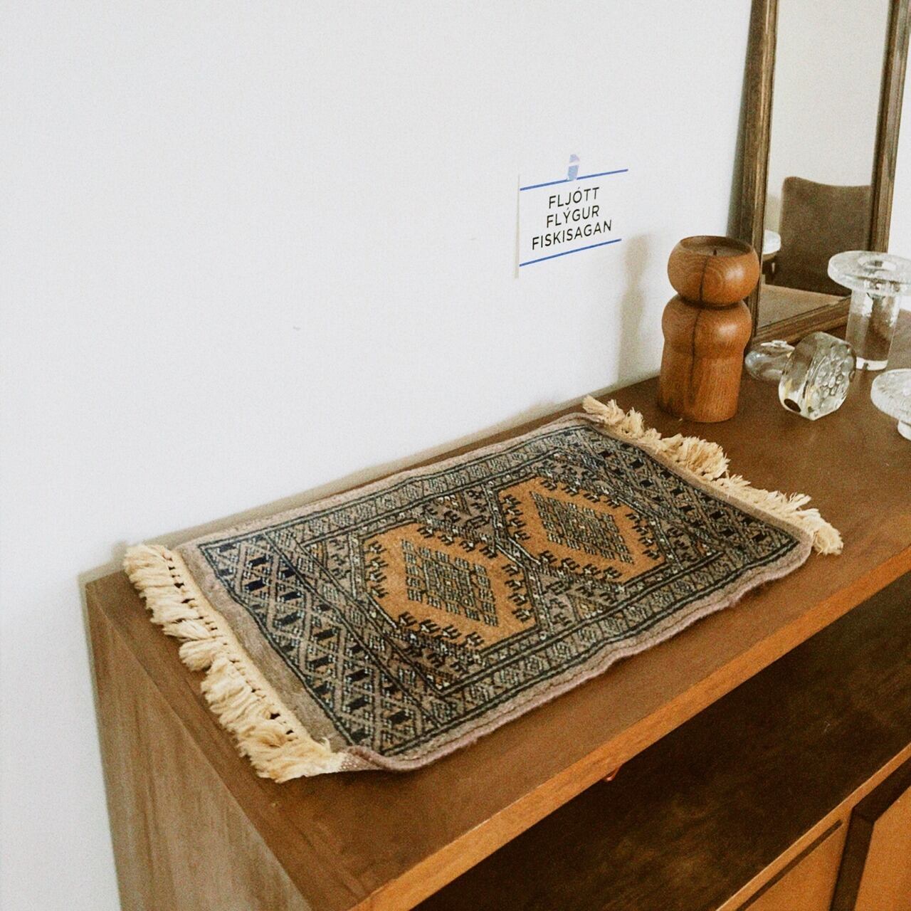 ひとつひとつ結ばれたタッセルがポイントになっているヴィンテージラグ。渋みのある、ぐっと落ち着いた色合いで、花瓶敷にしたり、少し長さがあるのでベッドサイドの足元に置いたり。色は違いますが、表裏同じ柄です。ラクダのプリントが可愛いラベルが裏についています。