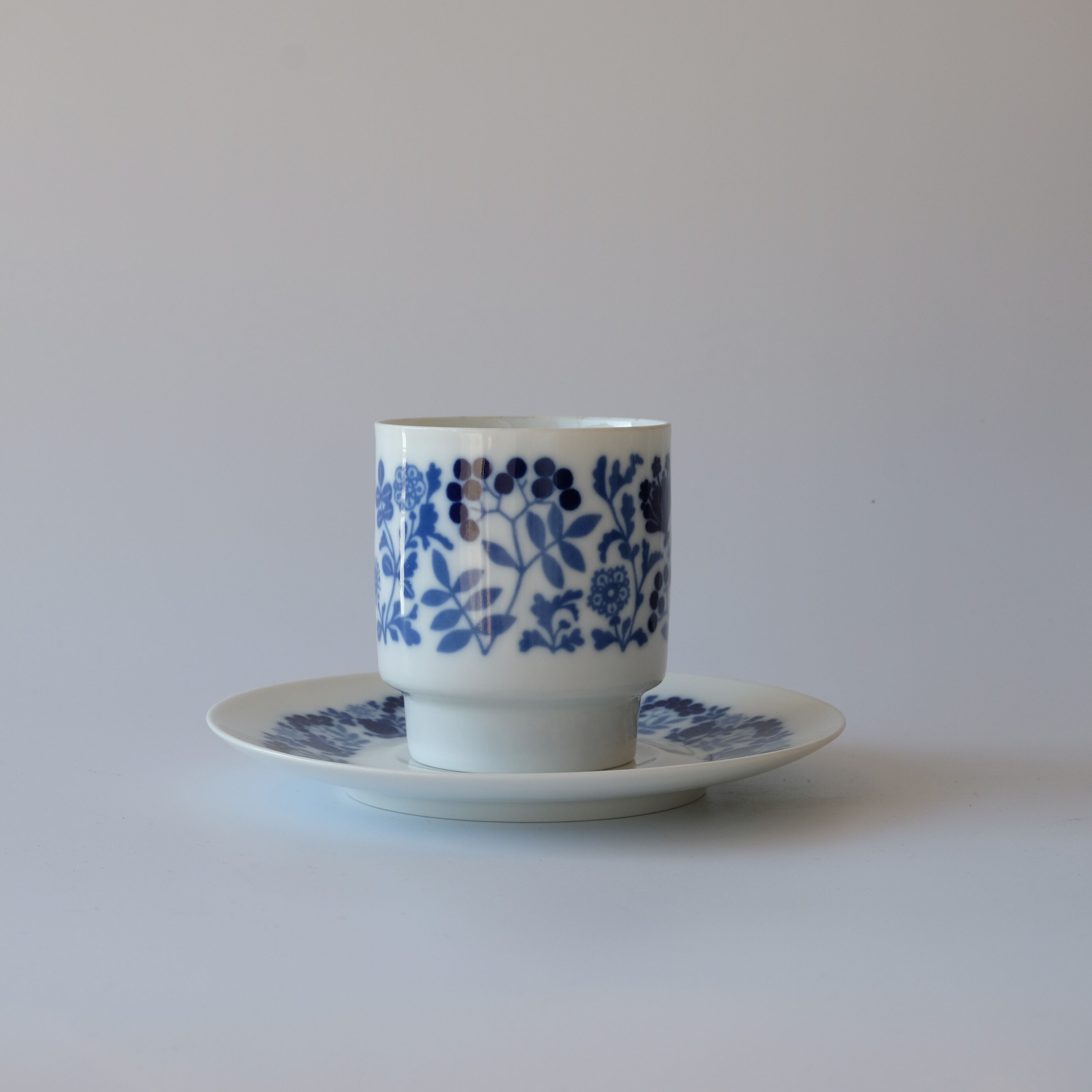 青い花と実が舞うように描かれた「Blumenspiel(=花遊び)」のデコレーションに心ときめく、カップ・ソーサー・プレートの3点セットです。